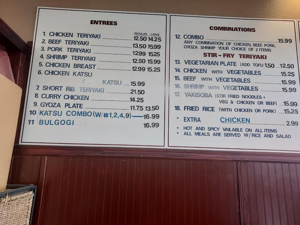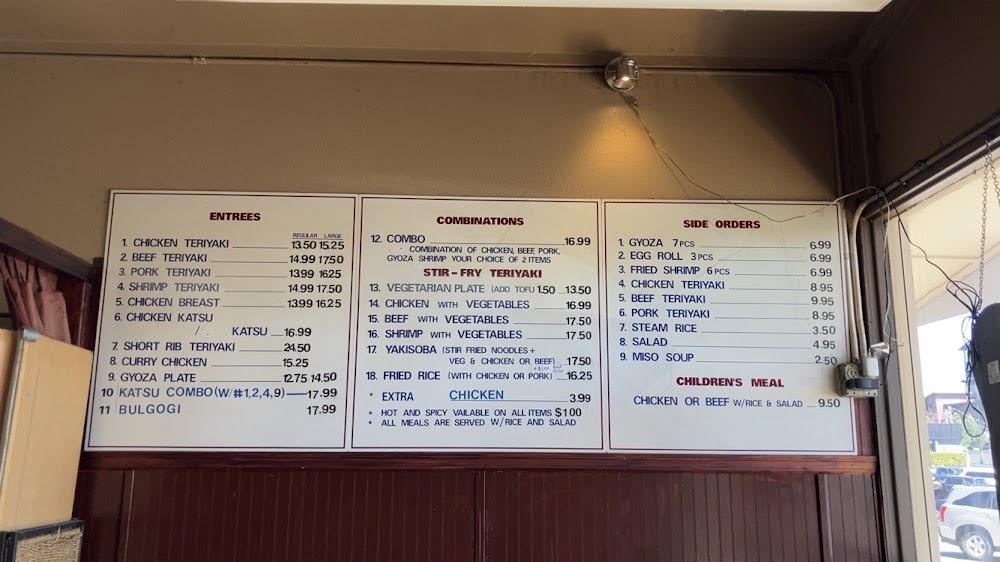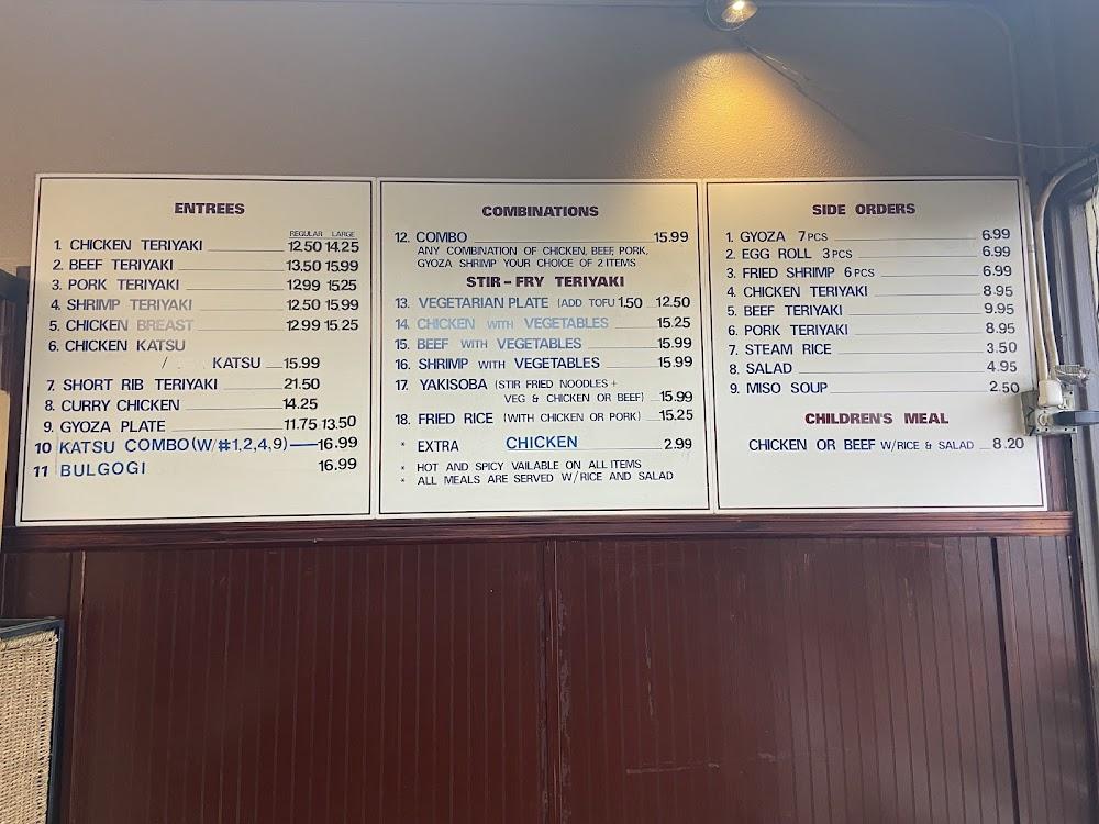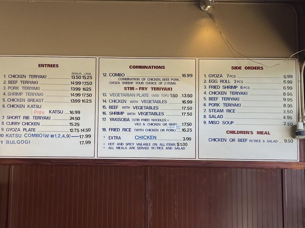 The menu at Ichiban Teriyaki features twelve main dishes. Teriyaki items take the lead, with chicken, pork, and tofu options available. Each teriyaki dish showcases a distinctive sauce that balances flavors well. Guests enjoy a choice between steam rice and salads as side dishes.
